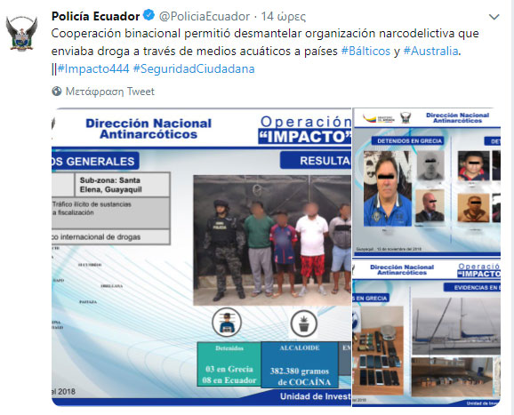 Σύμφωνα με την επίσημη ανακοίνωση της ΕΛ.ΑΣ «ο 63χρονος και ο 41χρονος, ήταν υπεύθυνοι για τον σχεδιασμό, οργάνωση, χρηματοδότηση και μεθόδευση της θαλάσσιας μεταφοράς με το ιστιοπλοϊκό σκάφος μεγάλης ποσότητας κοκαΐνης, από το Εκουαδόρ στην Αυστραλία. Άμεσος συνεργάτης αυτών ήταν ο 42χρονος Έλληνας, ο οποίος ήταν υπεύθυνος για τον έλεγχο και διεκπεραίωση των λεπτομερειών και διαδικασιών της επικείμενης μεταφοράς (έλεγχος καταλληλόλητας σκάφους, ανεύρεση skippers αυτού)».