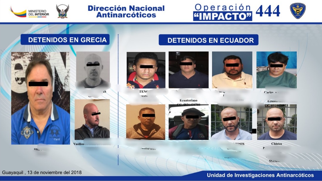 Συνολικά έχουν συλληφθεί εννέα άτομα, έξι στον Ισημερινό και τρεις στην Ελλάδα. Οι τρεις συλληφθέντες στην Ελλάδα είναι ένας 42χρονος ιδιοκτήτης καφετέριας που είναι γιος αστρολόγου, ένας 63χρονος ιδιοκτήτης μάντρας πολυτελών αυτοκινήτων και ένας 41χρονος Έλληνας αλβανικής καταγωγής, που είχε συλληφθεί στην Ιταλία για 250 κιλά χασίς.