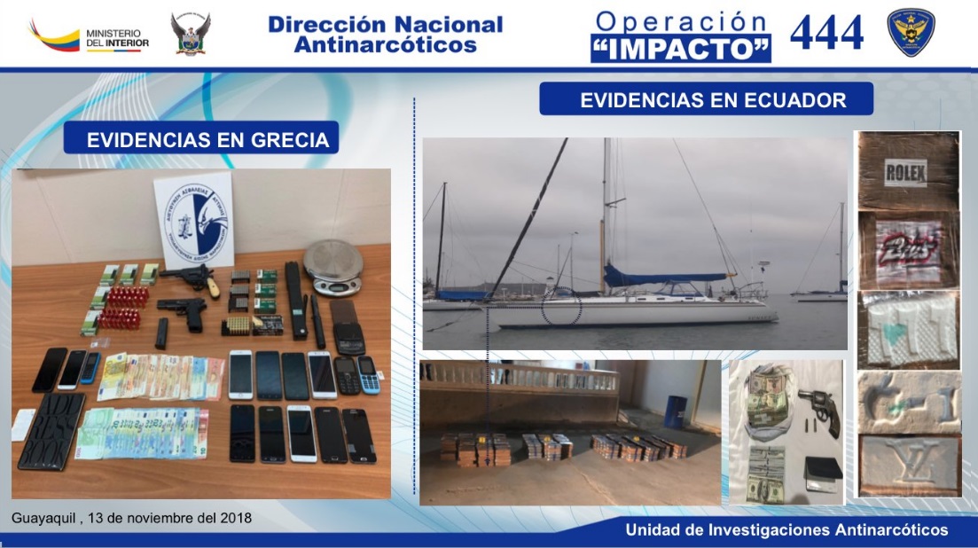 Για την υπόθεση έχουν ήδη κατασχεθεί 382 κιλά κοκαΐνης σε ιστιοφόρο στο Εκουαδόρ, ενώ στην Ελλάδα κατασχέθηκαν ένα πιστόλι, ένα περίστροφο, μία συσκευή ηλεκτρικής εκκένωσης, 223 φυσίγγια και δύο ζυγαριές ακριβείας.