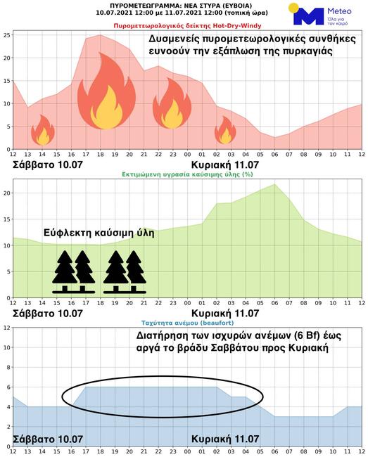 Ειδικότερα, η πυρκαγιά στα Νέα Στύρα που εκδηλώθηκε νωρίς το μεσημέρι, συμπίπτει με σημαντική επιδείνωση των πυρομετεωρολογικών συνθηκών. Με βάση τις επιχειρησιακές προγνώσεις υψηλής ανάλυσης του ΕΑΑ – meteo.gr, οι δυσμενείς πυρομετεωρολογικές συνθήκες (υψηλή θερμοκρασία, χαμηλή υγρασία καύσιμης ύλης, ισχυροί άνεμοι), αναμένεται να διατηρηθούν έως και αργά το βράδυ του Σαββάτου (10.07.2021) προς Κυριακή (11.07.2021).