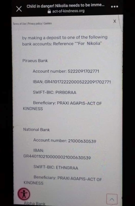 Η Νικολία πρέπει να υποβληθεί άμεσα σε χειρουργική αφαίρεση του όγκου η οποία κοστίζει 81.270 ευρώ. Η επέμβαση έχει προγραμματιστεί στα τέλη του Μαΐου και θα πραγματοποιηθεί σε ειδικό κέντρο της Γερμανίας.