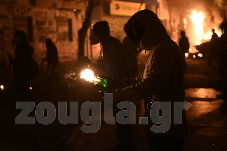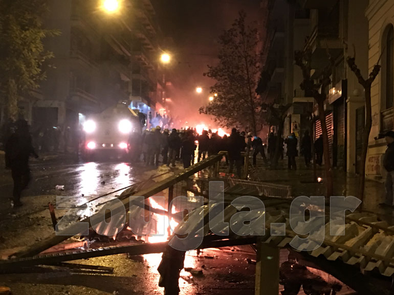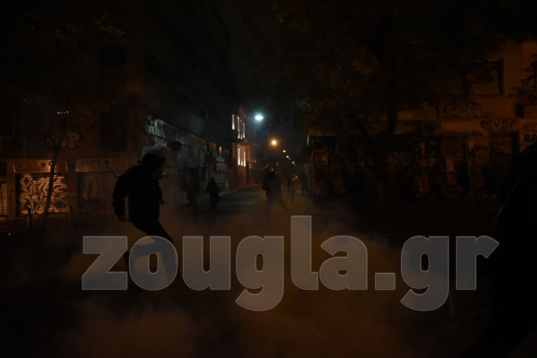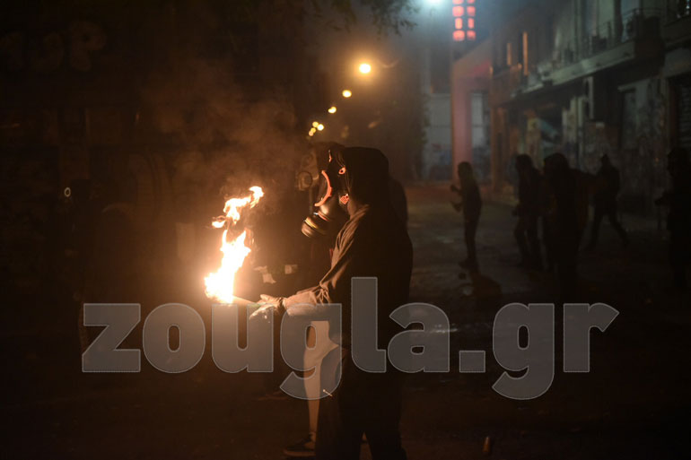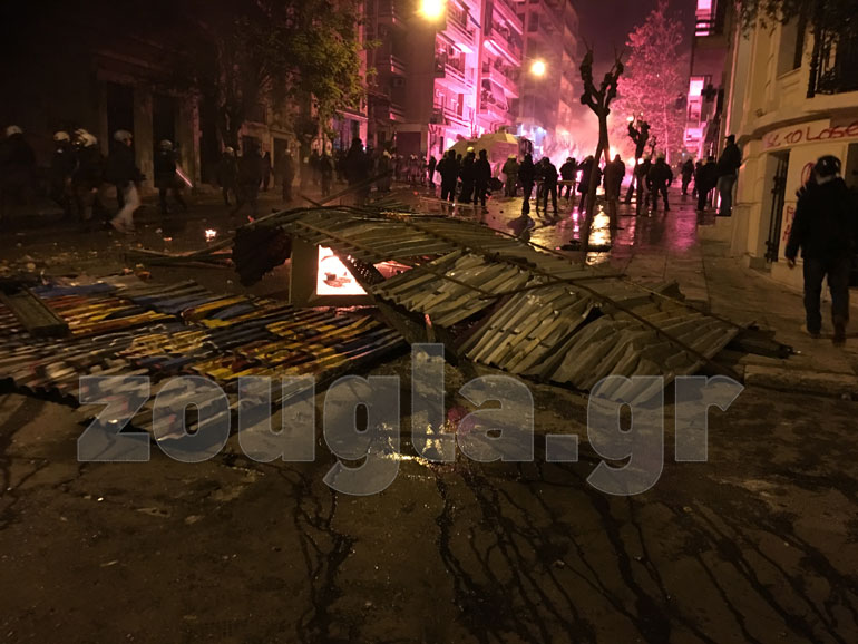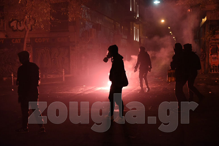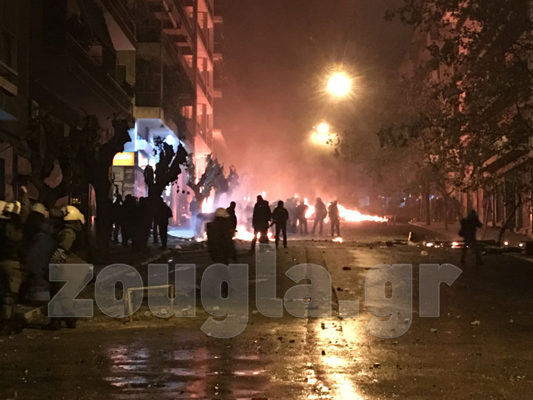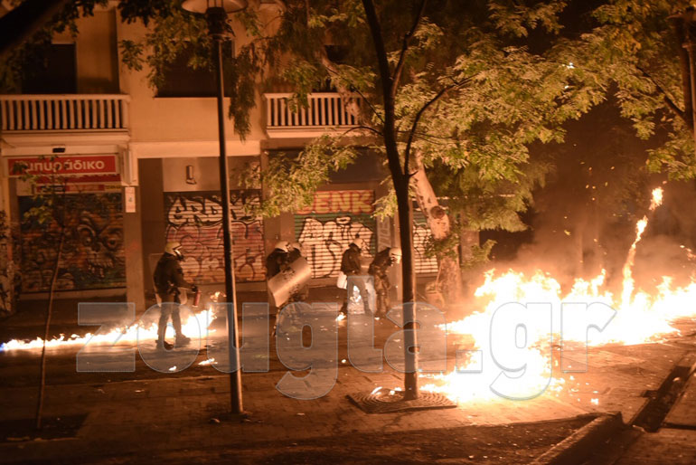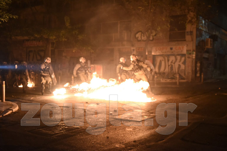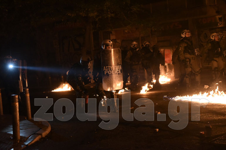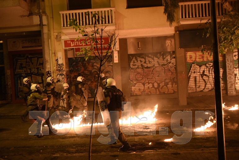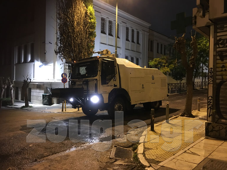 Η αστυνομία, με πιο επιθετική τακτική αυτή τη φορά, επιστράτευσε τρία υδροφόρα οχήματα – αύρες και έσπασε τα οδοφράγματα που είχαν στήσει στα Εξάρχεια κουκουλοφόροι, ενώ προχώρησε και σε περισσότερες από 60 προσαγωγές και 13 συλλήψεις.