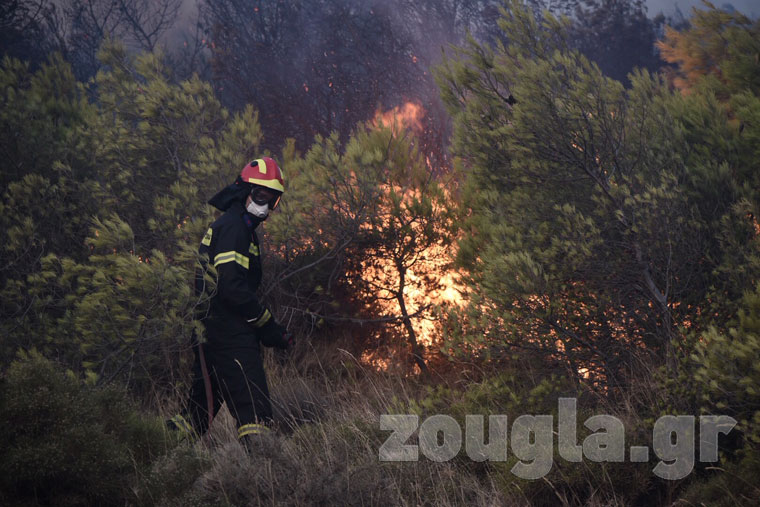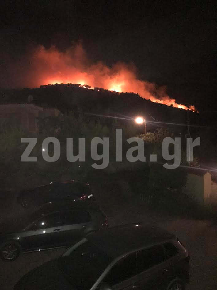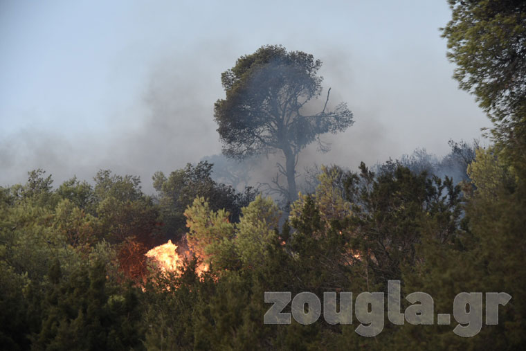 Το μέτωπο της πυρκαγιάς δεν απειλεί σπίτια σε κοντινή απόσταση, σύμφωνα με την Πυροσβεστική, ενώ έχει οριοθετηθεί.