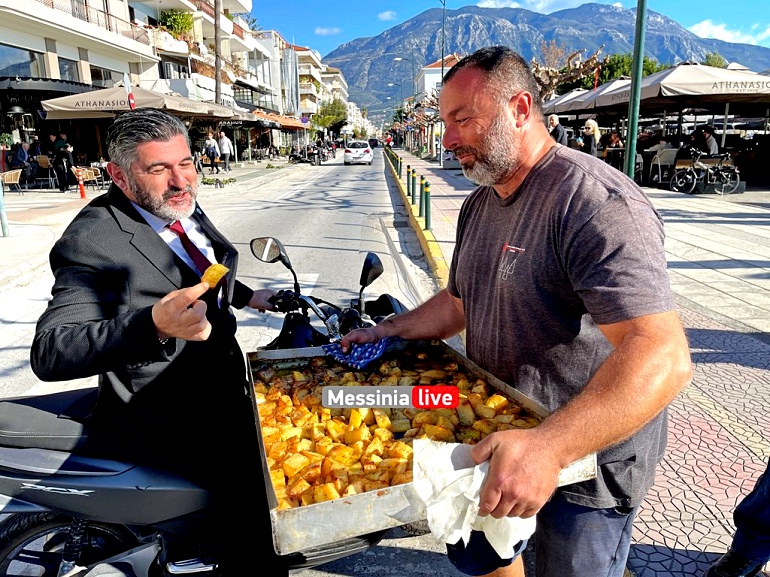 Φίλοι και περαστικοί δέχτηκαν τα κεράσματα από το αρνάκι που ψήθηκε στη σούβλα και τις πεντανόστιμες πατάτες φούρνου! Σεφ ο Χάρης Βγενής και οι φίλοι του, έτσι για … “να πάει καλά η χρονιά”!