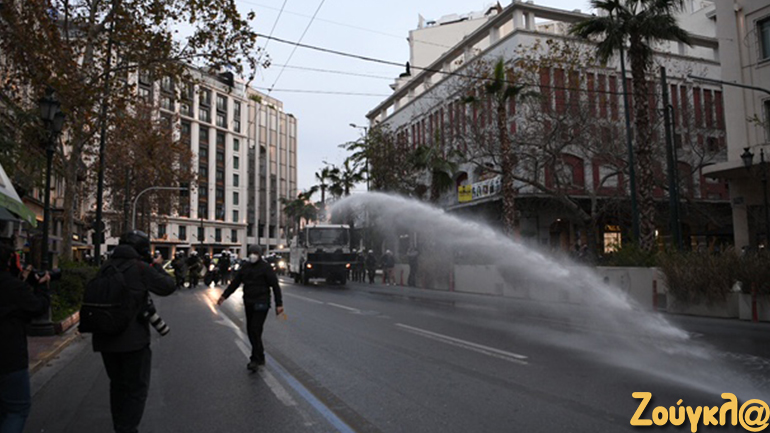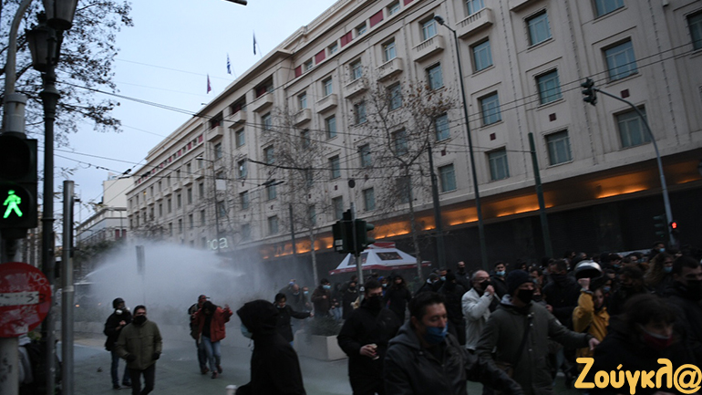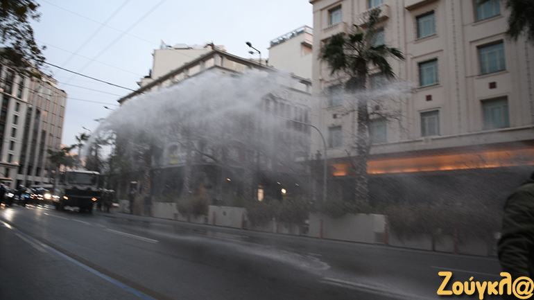 Λίγο μετά τις 18:00 επικράτησε ένταση με την αστυνομία να προχωρά σε ρίψη νερού με την «Αύρα», ενώ υπήρξαν και προσαγωγές, όταν οι συγκεντρωμένοι έφτασαν στη συμβολή της Σταδίου με την πλατεία Συντάγματος και οι αστυνομικοί τους απώθησαν, μη επιτρέποντας σε κανέναν να περάσει.