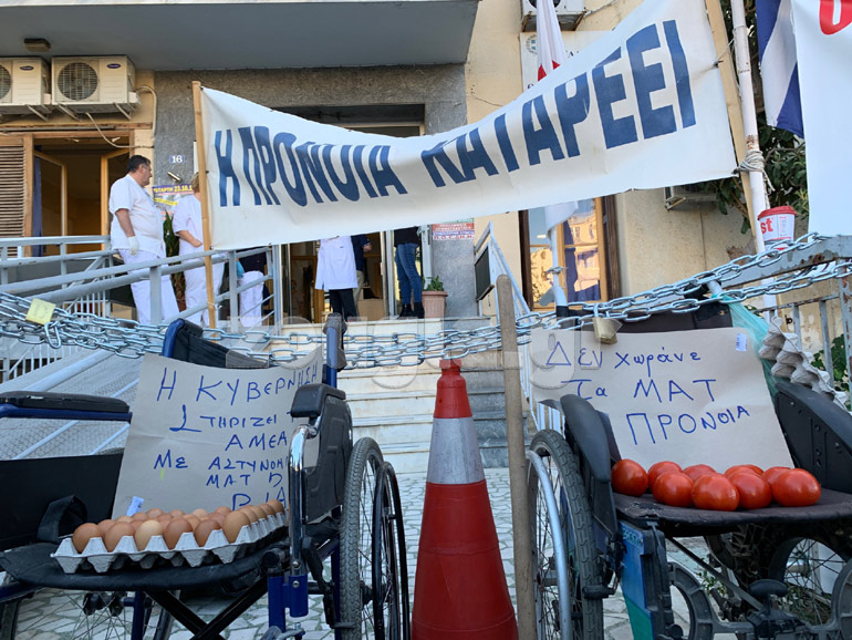 Συνεχίζονται οι διαμαρτυρίες μελών της ΠΟΕΔΗΝ στην προνοιακή δομή της Γλυφάδας, η οποία, όπως καταγγέλλουν, κλείνει, με αποτέλεσμα οι 52 φιλοξενούμενοι να μένουν στον δρόμο.