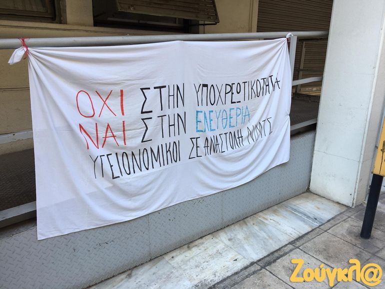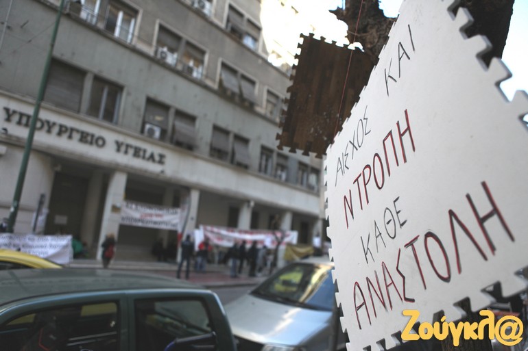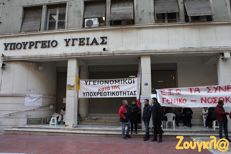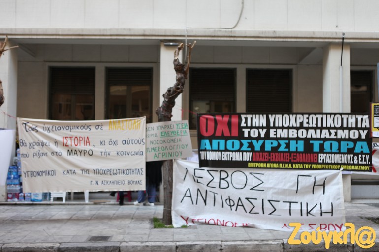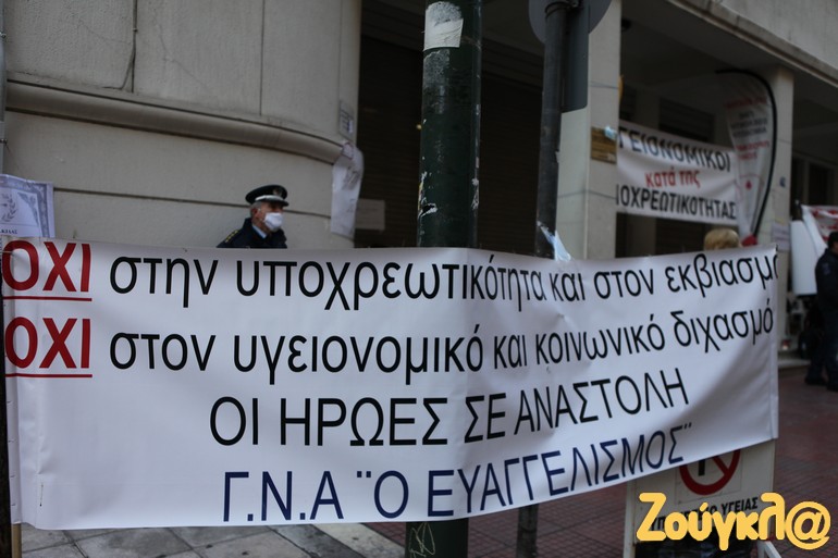 Επιμένουν με την παρουσία τους έξω από το υπουργείο Υγείας οι υγειονομικοί που βρίσκονται σε αναστολή.