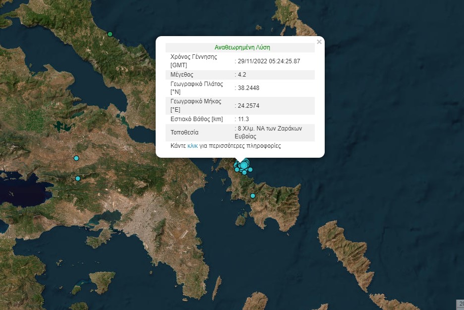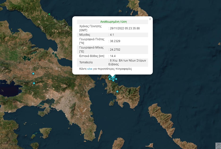 Ακολούθησε ασθενής σεισμική δόνηση με μέγεθος 4,1 στην κλίμακα Ρίχτερ, στις 07:23 ώρα Ελλάδος, σε απόσταση 56 χλμ. ανατολικά/βορειανατολικά των Αθηνών, σύμφωνα με το Γεωδυναμικό Ινστιτούτο, με το επίκεντρο της δόνησης εντοπίζεται στο θαλάσσιο χώρο 8 χλμ. βορειανατολικά των Νέων Στύρων Εύβοιας.