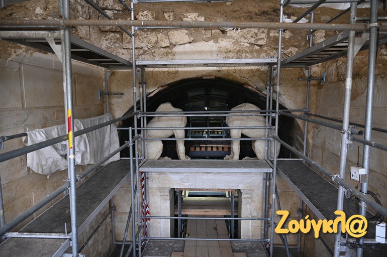 Τον Αύγουστο του 2014 η ανασκαφή αποκάλυψε την είσοδο του τύμβου, όπου βρέθηκε θύρα πάνω από την οποία υπάρχουν δύο μαρμάρινες σφίγγες από τις οποίες λείπουν τα κεφάλια και τα φτερά. Κατά τη συνέχεια των ανασκαφών, στο εσωτερικό του τύμβου, πάνω σε πεσσούς, βρέθηκαν σκαλισμένες δύο Καρυάτιδες. Ήδη και από το εξωτερικό του μνημείου, αλλά και στις σφίγγες, στις Καρυάτιδες και στο μικρό τμήμα του μνημείου που αποκαλύφθηκε, υπήρχαν ίχνη χρωμάτων που διακοσμούσαν την κατασκευή και τα γλυπτά του.
