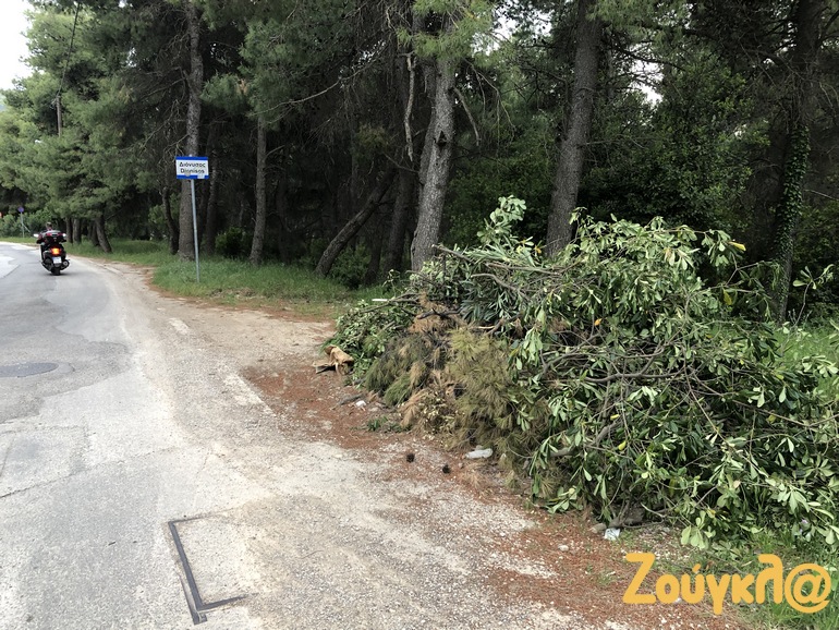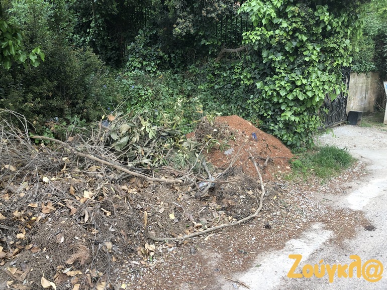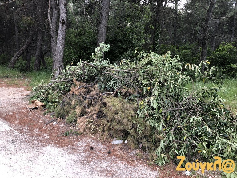 Οδός Μουσών, Διόνυσος. «Λόφος» από επιμελώς παρατημένα κλαδιά, δίπλα στο δάσος και σε κατοικία.