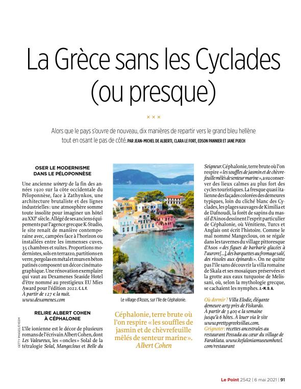 Με εξασέλιδο αφιέρωμα σε «ανεξερεύνητους» ελληνικούς προορισμούς υπό τον τίτλο «Η Ελλάδα χωρίς τις Κυκλάδες (ή σχεδόν)» («La Grèce sans les Cyclades (ou presque)») κυκλοφορεί το τελευταίο τεύχος (6ης Μαΐου 2021) του μεγαλύτερης κυκλοφορίας εβδομαδιαίου πολιτικοοικονομικoύ περιοδικού της Γαλλίας «Le Point». Το αφιέρωμα, όπως τονίζεται σε σχετική ανακοίνωση, υλοποιήθηκε με την καθοριστική συμβολή της υπηρεσίας ΕΟΤ Γαλλίας και με αφορμή την επίσημη έναρξη της τουριστικής περιόδου στην Ελλάδα για το 2021.