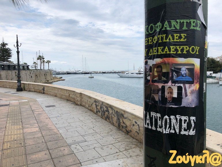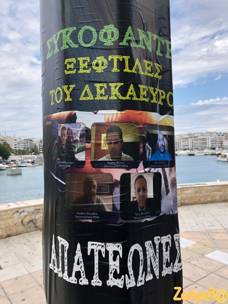 Σε έλεγχο, που έγινε από τους αστυνομικούς της Ομάδας Δ.Ι.Α.Σ, που πήραν μέρος στην επιχείρηση, βρέθηκαν στο πορτ μπαγκάζ του αυτοκινήτου 220 αφίσες, ίδιες με αυτές, που είχαν τοιχοκολληθεί, ακόμη και έξω από τα γραφεία της ΠΑΕ Ολυμπιακός και στο γήπεδο Καραϊσκάκη, οι οποίες εμφάνιζαν τα πρόσωπα των τεσσάρων δημοσιογράφων και του δικηγόρου.
