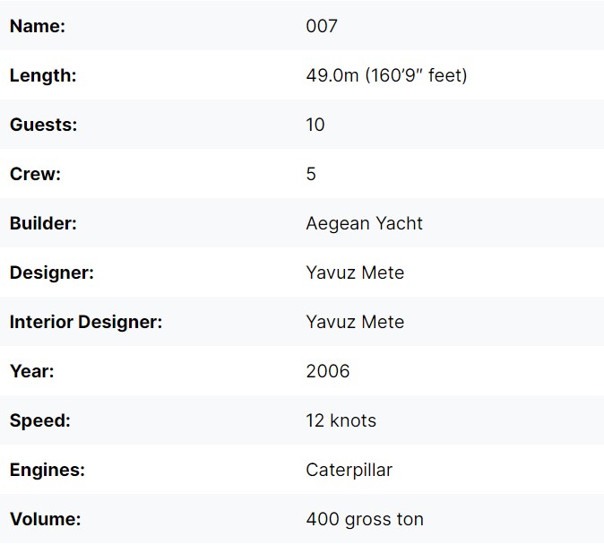 Το σκάφος έχει φτιαχτεί στα τουρκικά ναυπηγεία Tuzla, στη θάλασσα του Μαρμαρά, ενώ μπορεί να φιλοξενήσει δέκα άτομα σε έξι ευρύχωρες καμπίνες, εκτός από τα δέκα μέλη του πληρώματος και τροφοδοτείται από δύο μηχανές 2X 1155 BHP Caterpillars. Να σημειωθεί ότι αυτή είναι η πιο πολυφωτογραφημένη θαλαμηγός στον κόσμο.
