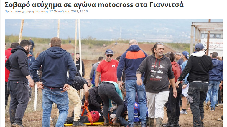 Τα επόμενα 24ωρα θεωρούνται κρίσιμα για την υγεία τους. Πρόκειται για έναν 27χρονο και έναν 16χρονο, οι οποίοι τραυματίστηκαν σοβαρά όταν ένας αναβάτης, που συμμετείχε στον αγώνα για το Πανελλήνιο Πρωτάθλημα Motocross, έχασε τον έλεγχο της μηχανής του κι έπεσε πάνω σε προστατευτική περίφραξη και σε κολόνα.