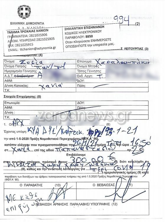 Σε επώνυμη καταγγελία ότι δέχτηκε πρόστιμο 300 ευρώ για μη τήρηση μέτρων κατά του κορωνοϊού επειδή δεν φορούσε μάσκα μέσα στο αυτοκίνητο, όπου όμως βρισκόταν μαζί με τον σύντροφό της και όχι με κάποιον άγνωστο, προχωράει επώνυμα Χανιώτισσα επαγγελματίας. Η κα. Σοφία Χαραλαμπάκη καταγγέλλει τον υπερβάλλοντα ζήλο αστυνομικού που τη σταμάτησε, όπως φαίνεται και στο πρόστιμο που της επιβλήθηκε, στις 26 Ιανουαρίου, σε έλεγχο για την τήρηση των επιδημιολογικών μέτρων.