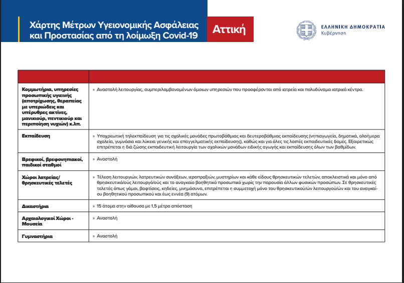 Σχετικά με τους χώρους λατρείας, η τέλεση λειτουργιών, λατρευτικών συνάξεων, ιεροπραξιών, μυστηρίων και κάθε είδους θρησκευτικών τελετών γίνεται από θρησκευτικούς λειτουργούς και το αναγκαίο βοηθητικό προσωπικό χωρίς την παρουσία άλλων φυσικών προσώπων. Σε θρησκευτικές τελετές, όπως γάμοι, βαφτίσεις, κηδείες, μνημόσυνα, επιτρέπεται η συμμετοχή μόνο του θρησκευτικού λειτουργού, του αναγκαίου βοηθητικού προσωπικού και έως εννέα (9) ατόμων.