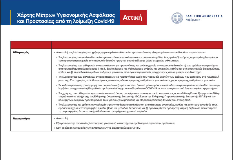 Όσον αφορά στις αθλητικές δραστηριότητες, εξακολουθούν να ισχύουν τα υφιστάμενα μέτρα, ενώ δεν υπάρχει κάποια διαφοροποίηση στα μέτρα που ισχύουν για τους αρχαιολογικούς χώρους, τις κινηματογραφικές προβολές, τα ζωντανά θεάματα και ακροάματα και τις λοιπές παραστατικές τέχνες, τα συνέδρια και τις εκθέσεις, καθώς και τις πρόβες και τα τηλεοπτικά και κινηματογραφικά γυρίσματα και ηχογραφήσεις.