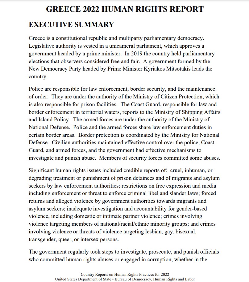 «Υπήρχαν αναφορές και καταγγελίες από μη κυβερνητικές οργανώσεις και διεθνείς οργανισμούς σχετικά με τις αποτυχίες της κυβέρνησης να διερευνήσει αποτελεσματικά τους ισχυρισμούς για καταχρηστικές ενέργειες, αστυνομικές πρακτικές και αναγκαστικές επιστροφές αιτούντων άσυλο» αναφέρεται χαρακτηριστικά.