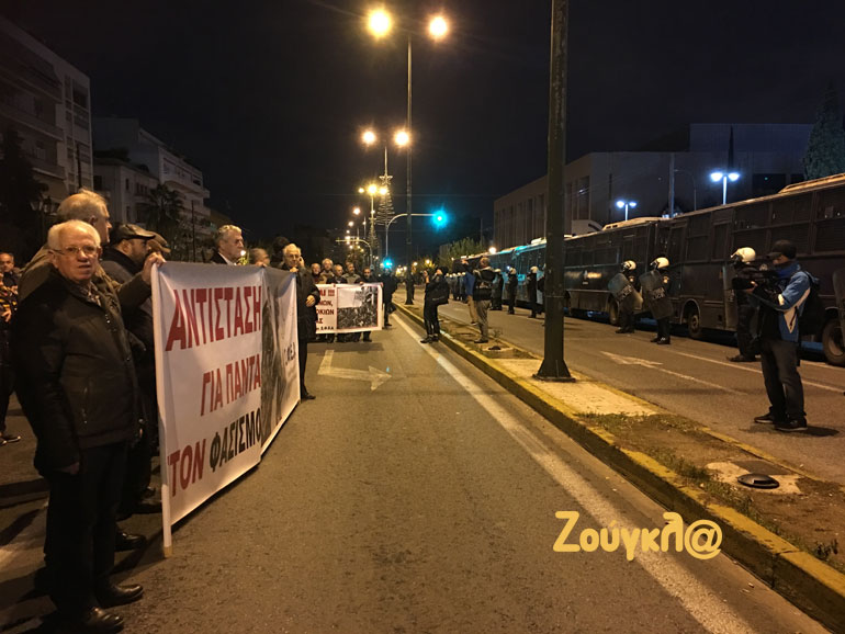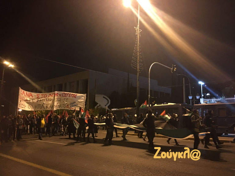 Η κεφαλή της πορείας περίπου στις 18.00 το απόγευμα έφθασε στην αμερικάνικη πρεσβεία. Με κεντρικό σύνθημα «Λευτεριά στο λαό, θάνατο στο φασισμό» οι διαδηλωτές καταδίκασαν το φασισμό, το ναζισμό καθώς κι αντίστοιχες συμπεριφορές.