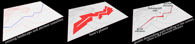 Με αυτές τις σκέψεις προσεγγίσαμε την ιστορία και την μνήμη του τόπου και αποφασίσουμε να χαράξουμε μία τομή ακριβώς στην ιστορική τοποθεσία της μάχης πάνω στο ίχνος που βρισκόταν τότε η ακτογραμμή. Επιχειρήσαμε λοιπόν να συνδυάσουμε μία πτυχωτή δυναμική διάταξη 300 πλακών στην ανωδομή υπολογισμένη αλγοριθμικά συνδυασμένη με ένα υγρό φίδι πάνω στη γη που θα συμβολίζει το θαλασσινό όριο, δημιουργώντας μία σειρά από διαδοχικά κάδρα και έναν έντονα βιωματικό χώρο. Βασική αρχή σχεδιασμού αποτελεί το γεγονός ότι δεν παρεμβαίνουμε καθόλου στο ανάγλυφο της ιστορικής περιοχής και δημιουργούμε στο νέο γεωλογικό κομμάτι ένα παράθυρο στην ιστορία.