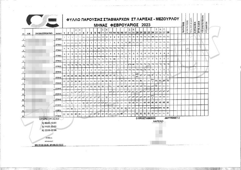 Στις 28-02-2023 σταθμάρχης υπηρεσίας 14:00 – 23:00 ήταν ο Παυλόπουλος Κωνσταντίνος, με ενισχυτικό τον Παναγιώτη Χαμηλό. Ο Σαμαράς Βασίλης είχε ωράριο 22:00 – 07:00 και ήταν ο μοναδικός σταθμάρχης στη βραδινή βάρδια. Μεταξύ 22:00 – 23:00 υπήρχαν και υπηρετούσαν ταυτόχρονα τρεις σταθμάρχες, με επικεφαλής τον Παυλόπουλο ως αρχαιότερο στην υπηρεσία.
