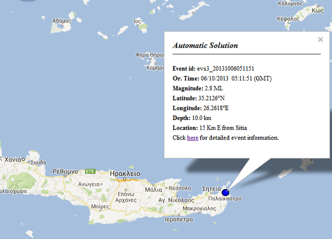 Το επίκεντρο του σεισμού εντοπίζεται 15 χιλιόμετρα ανατολικά της Σητείας και το εστιακό του βάθος υπολογίζεται στα 10 χιλιόμετρα.