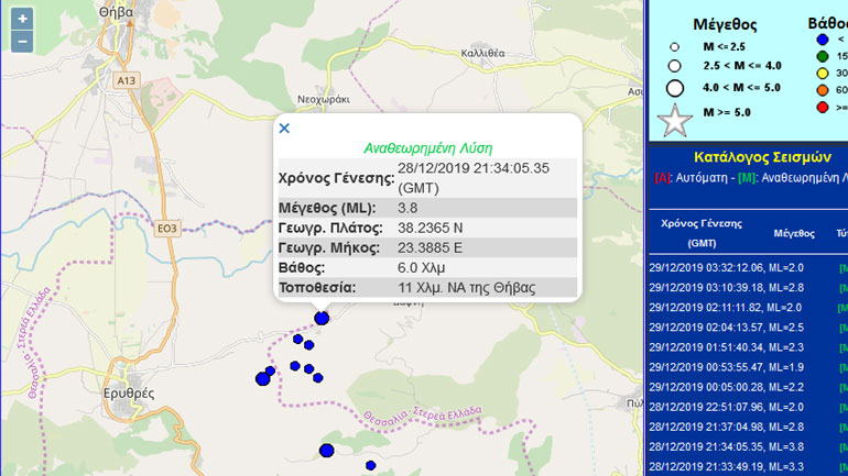 Σεισμική δόνηση μεγέθους 3,8 της κλίμακας Ρίχτερ σημειώθηκε στις 23:34 το βράδυ του Σαββάτου, στη Θήβα. Το επίκεντρο της δόνησης εντοπίζεται 11 χιλιόμετρα νοτιοανατολικά της Θήβας. Ο σεισμός είχε εστιακό βάθος 6 χλμ.
