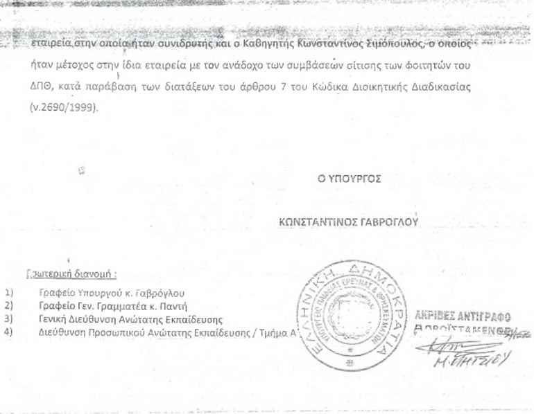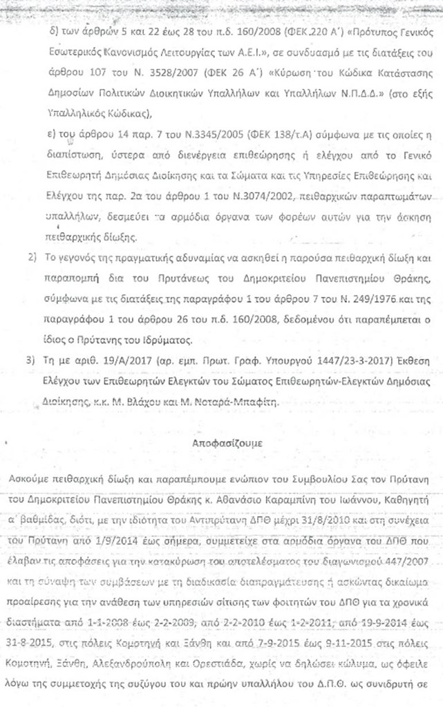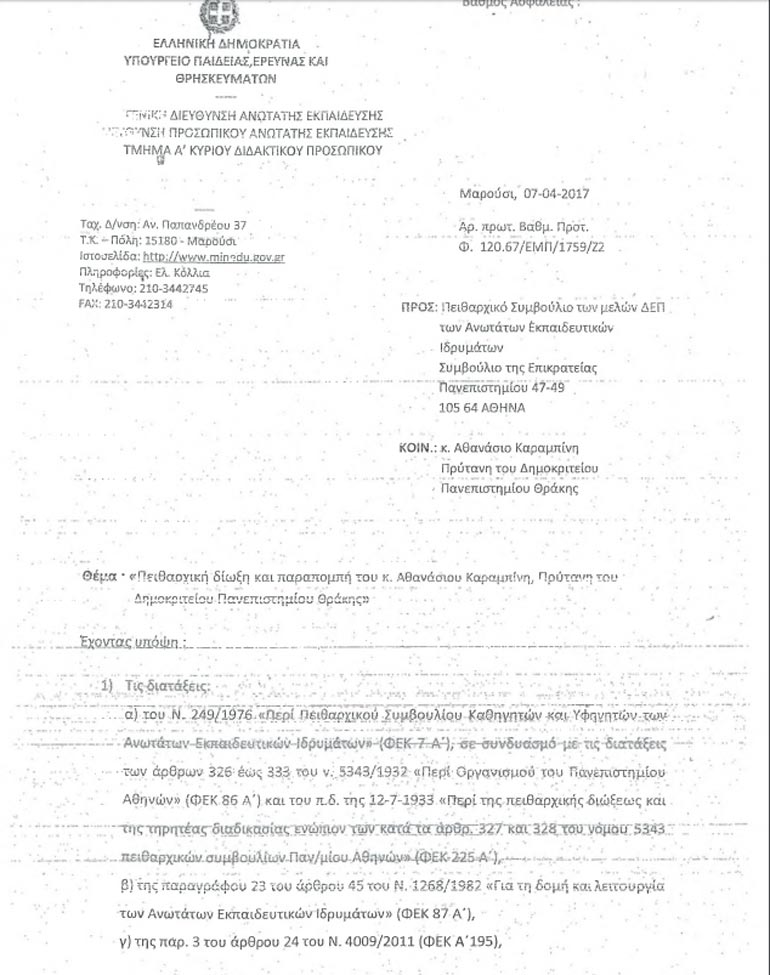 «Σας επισυνάπτουμε την προαναγγελθείσα από βήματος της Βουλής, από τον Υπουργό Παιδείας κ. Κ. Γαβρόγλου, πειθαρχική δίωξη του Πρύτανη του Δημοκριτείου Πανεπιστημίου Θράκης καθηγητή κ. Αθανασίου Καραμπίνη, η οποία βασίσθηκε σε ένα αναιτιολόγητο πόρισμα του Σώματος Επιθεωρητών Ελεγκτών Δημόσιας Διοίκησης με στόχο να πλήξει τον Πρύτανη.