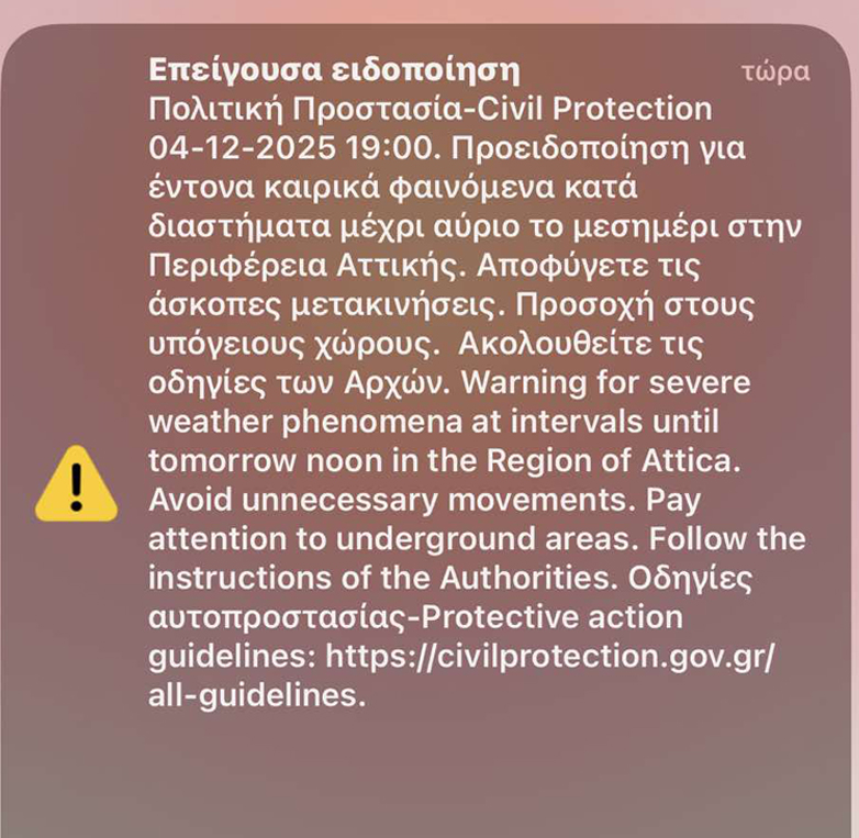 Μήνυμα του 112 εστάλη στους κατοίκους της Αττικής, προειδοποιώντας τους για έντονα καιρικά φαινόμενα, κατά διαστήματα, μέχρι το μεσημέρι της Παρασκευής, 5 Δεκεμβρίου, στην περιοχή και καλώντας τους να αποφεύγουν τις άσκοπες μετακινήσεις και να επιδείξουν προσοχή στους υπόγειους χώρους.