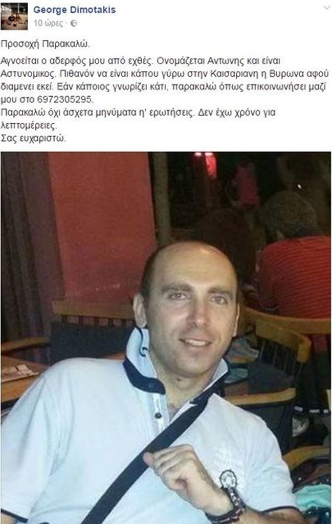 «Προσοχή Παρακαλώ. Αγνοείται ο αδερφός μου από εχθές (σ.σ. 16/4). Ονομάζεται Αντώνης και είναι Αστυνομικός. Πιθανόν να είναι κάπου γύρω στην Καισαριανή η Βύρωνα αφού διαμένει εκεί. Εάν κάποιος γνωρίζει κάτι, παρακαλώ όπως επικοινωνήσει μαζί μου στο 6972305295. Παρακαλώ όχι άσχετα μηνύματα η’ ερωτήσεις. Δεν έχω χρόνο για λεπτομέρειες. Σας ευχαριστώ».