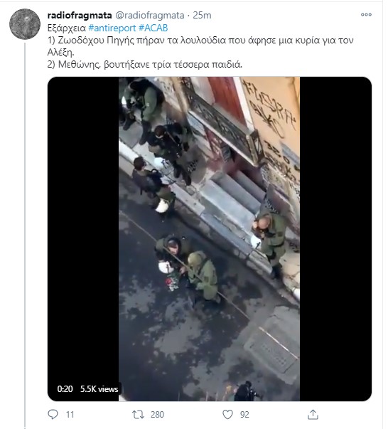 Όπως αναφέρεται στην ανάρτηση, «στην οδό Ζωοδόχου Πηγής, ένας αστυνομικός που ανήκει σε διμοιρία των ΜΑΤ καταστρέφει ένα μπουκέτο με λουλούδια» το οποίο φέρεται να το έχει αφήσει εκεί κάποια κυρία ή οποία – πάντα σύμφωνα με αυτούς που ανήρτησαν το βίντεο – ήθελε να πλησιάσει στο σημείο της δολοφονίας του Αλέξανδρου Γρηγορόπουλου. Στη συνέχεια, όπως φαίνεται στο βίντεο, ο αστυνομικός καταστρέφει το μπουκέτο με τα λουλούδια.