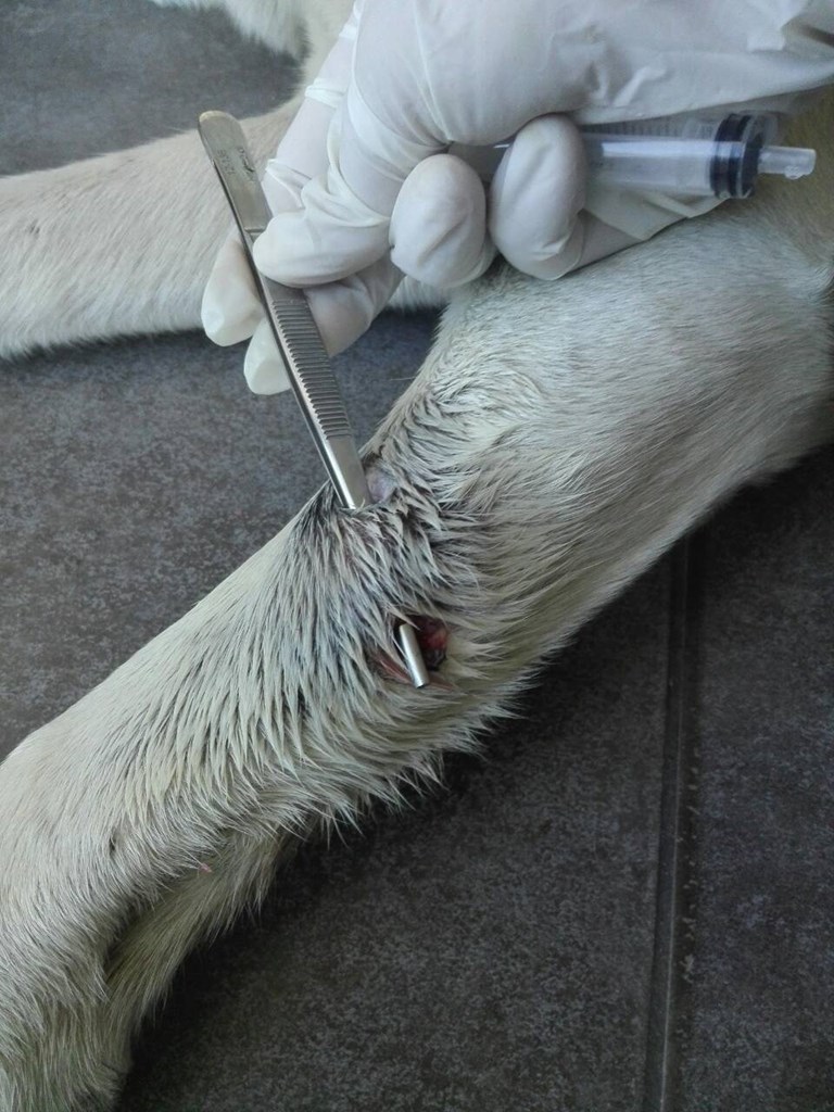 Το άτυχο σκυλάκι παρέμεινε για ώρες αβοήθητο, μέχρι το επόμενο πρωί να εντοπιστεί από γείτονες με ένα διαμπερές τραύμα στο μπροστινό αριστερό πόδι. Μέσα στην ατυχία του στάθηκε τυχερό. Ο αστυνομικός που έστρεψε το όπλο εναντίον του, το πυροβόλησε, στην κυριολεξία στα τυφλά, σε ένα σκοτεινό δρομάκι, ενώ κινείτο με μεγάλη ταχύτητα με τη μοτοσυκλέτα του και το πέτυχε στο πόδι και όχι σε ζωτικά όργανα ή στα οστά.