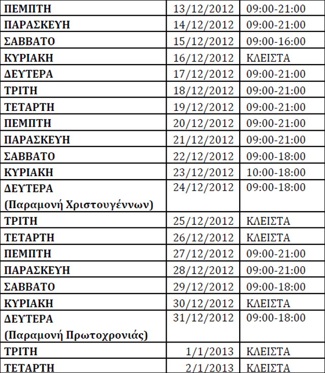 Η Ομοσπονδία Εμπορικών Συλλόγων Αττικής, όμορων νομών και νήσων Αιγαίου, σε συνεννόηση με τους Εμπορικούς Συλλόγους του Λεκανοπεδίου Αττικής-Μέλη της και συντονίζοντας τις προτάσεις τους, ανακοινώνει προς το καταναλωτικό κοινό ότι θα μπορεί να εξυπηρετηθεί μέσα στο πλαίσιο του εορταστικού ωραρίου Χριστουγέννων, που αρχίζει την Πέμπτη 13 Δεκεμβρίου 2012 ως ακολούθως: