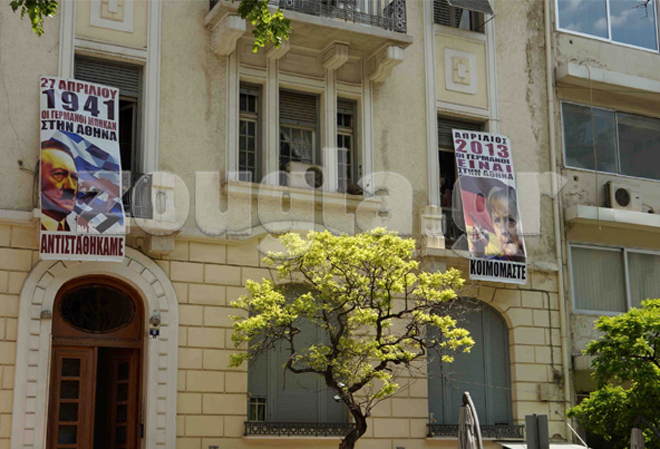 Ο κ. Κολλάτος συνελήφθη το μεσημέρι της Κυριακής για παραβίαση του άρθρου 181 «Προσβολή των συμβόλων του Ελληνικού Κράτους», καθώς ανάρτησε στην πρόσοψη του σπιτιού του δύο πανό με αντιγερμανικό περιεχόμενο.