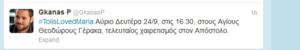 Ο χαμός του Απόστολου συγκλόνισε σήμερα χιλιάδες χρήστες στο twitter οι οποίοι δημιούργησαν το hashtag #TolisLovedMaria που ήταν και η τελευταία του επιθυμία πριν χάσει τη μάχη με την επάρατη νόσο.