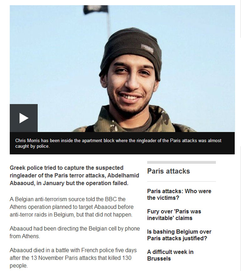 Ιδιαίτερη αίσθηση προκαλεί το δημοσίευμα του βρετανικού δικτύου BBC, σύμφωνα με το οποίο η Ελληνική Αστυνομία προσπάθησε να συλλάβει τον εγκέφαλο πίσω από τις πολύνεκρες επιθέσεις του Παρισιού, Abdelhamid Abaaoud, αλλά απέτυχε. «Αν η ελληνική αστυνομία τον είχε συλλάβει εγκαίρως, τότε οι επιθέσεις στη Γαλλία δεν θα είχαν συμβεί», σημειώνεται στο άρθρο χαρακτηριστικά.