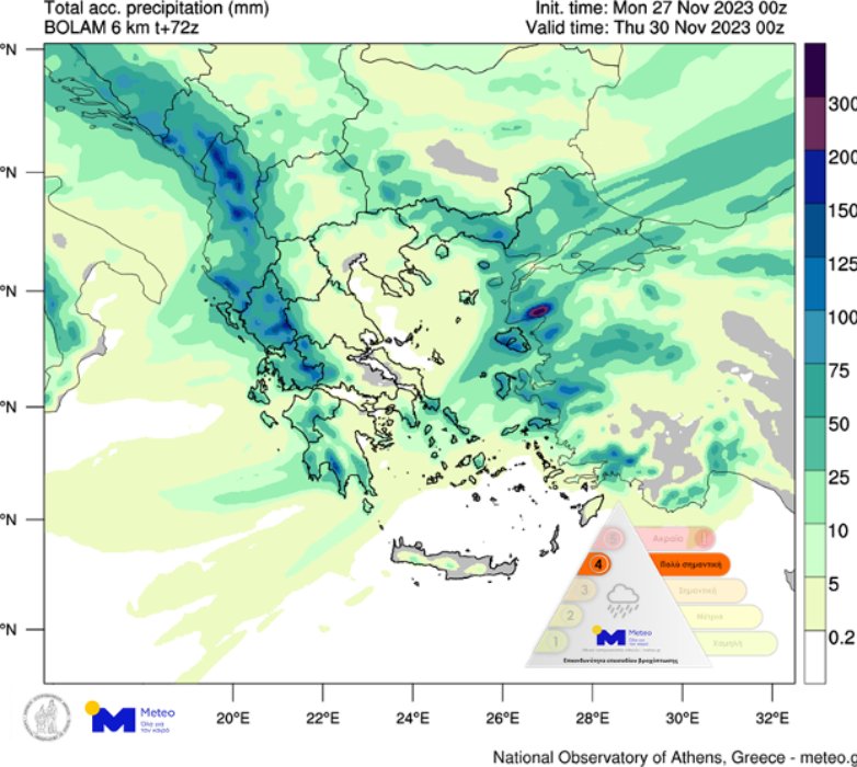 Σύμφωνα με την κατηγοριοποίηση του επεισοδίου βροχόπτωσης (Regional Precipitation Index), η οποία εφαρμόζεται από τη μονάδα Meteo του Εθνικού Αστεροσκοπείου Αθηνών, το επεισόδιο βροχόπτωσης για την Τρίτη (28/11), όπου αναμένονται τα πιο έντονα φαινόμενα, κατατάσσεται στην Κατηγορία 4 (Πολύ Σημαντική).