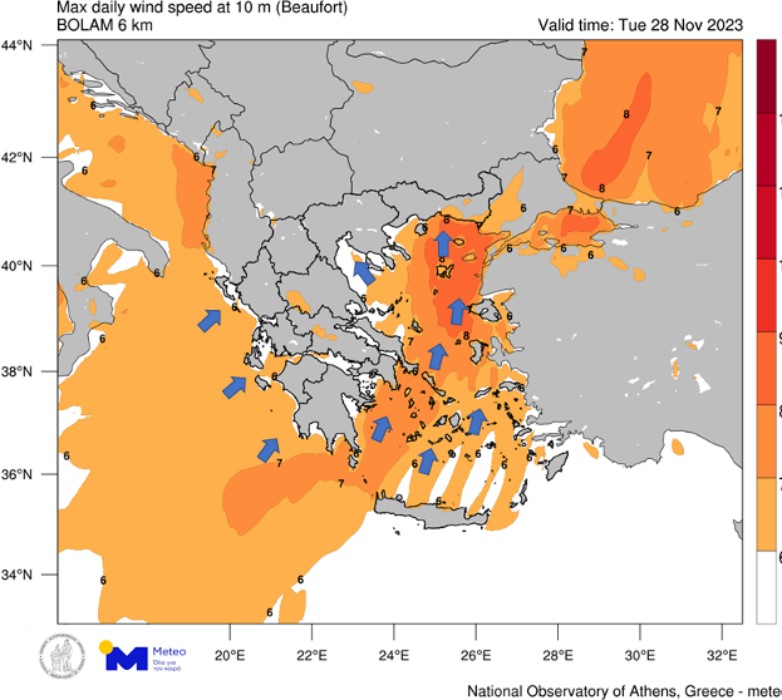 Οι εκτιμώμενες μέγιστες εντάσεις και διευθύνσεις των ανέμων την Τρίτη 28/11/2023, όπως υπολογίστηκε από το αριθμητικό μοντέλο πρόγνωσης καιρού του meteo.gr / Εθνικού Αστεροσκοπείου Αθηνών.