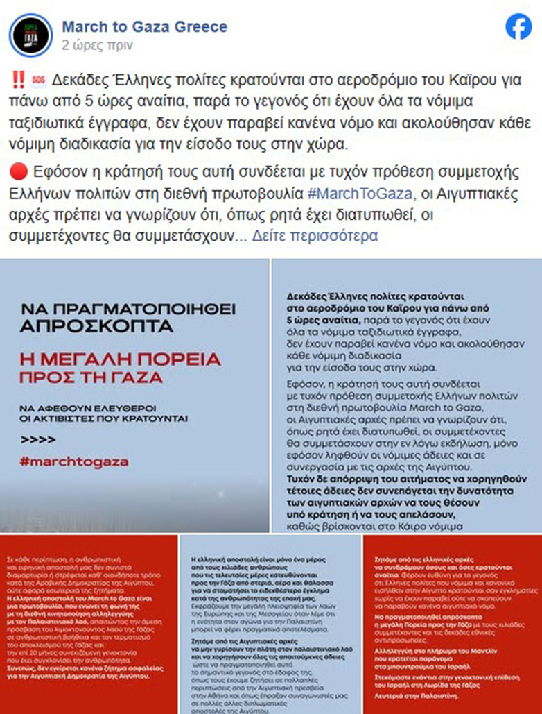 Η σελίδα «March to Gaza Greece» εξέδωσε σχετική ανακοίνωση: