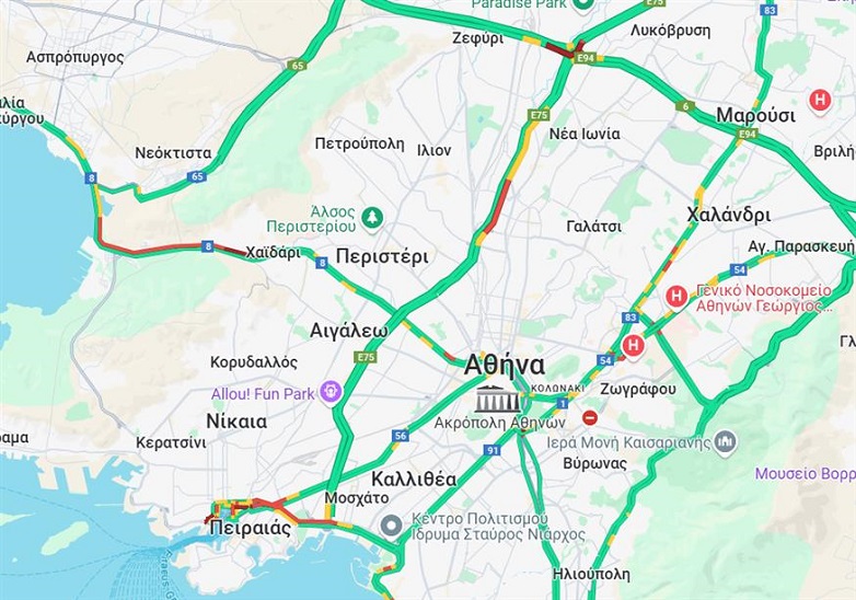 Το πιο έντονο πρόβλημα σημειώνεται στους δρόμους γύρω από το λιμάνι του Πειραιά, ενώ κίνηση επικρατεί και στην περιφερειακή στο Σχιστό και στη Λεωφόρο Αθηνών στο Χαϊδάρι.