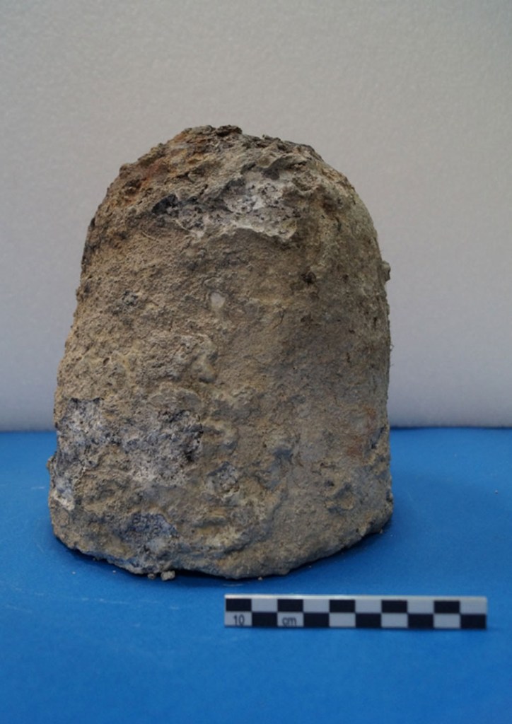 Στην επίπεδη άνω όψη υπάρχουν δύο μικρές τετράγωνες εγκοπές για το στέλεχος ανάρτησής του. Βάσει των χαρακτηριστικών του, το αντικείμενο ταυτίζεται με βολίδα για τη μέτρηση του βάθους του θαλασσίου βυθού και τον έλεγχο της φύσης του. Τη δειγματοληψία από το βυθό εξυπηρετούσε η κοίλανση στη βάση με τους ήλους από σίδερο ή χαλκό, που παγίδευαν λασπώδη άμμο, λίθους και ιζήματα, αποκαλύπτοντας την ιδιαίτερη χρησιμότητα του αντικειμένου για την περίπτωση ελιγμών ή αγκυροβολίας. Αυτό το ταπεινό εργαλείο θεωρείται ζωτικής σημασίας για την ασφαλή ναυσιπλοΐα κατά την αρχαιότητα.