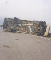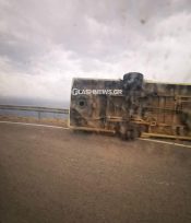 Με τις ρόδες στον αέρα, κατέληξε λεωφορείο που ανετράπη στον δρόμο που οδηγεί στην Ανώπολη.