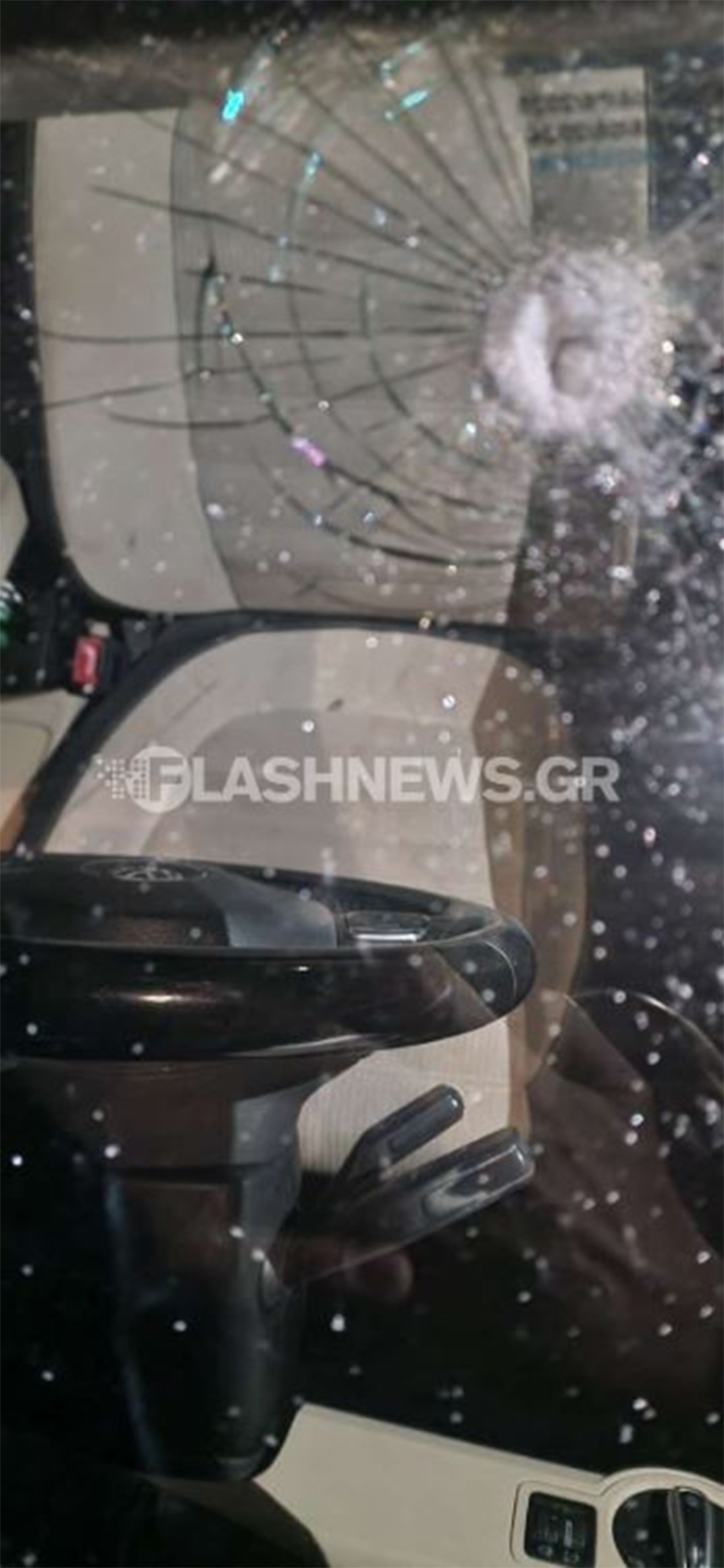 Όπως φαίνεται και στις φωτογραφίες η σφαίρα είχε τρυπήσει το παρμπρίζ και είχε πέσει στην θέση του οδηγού.