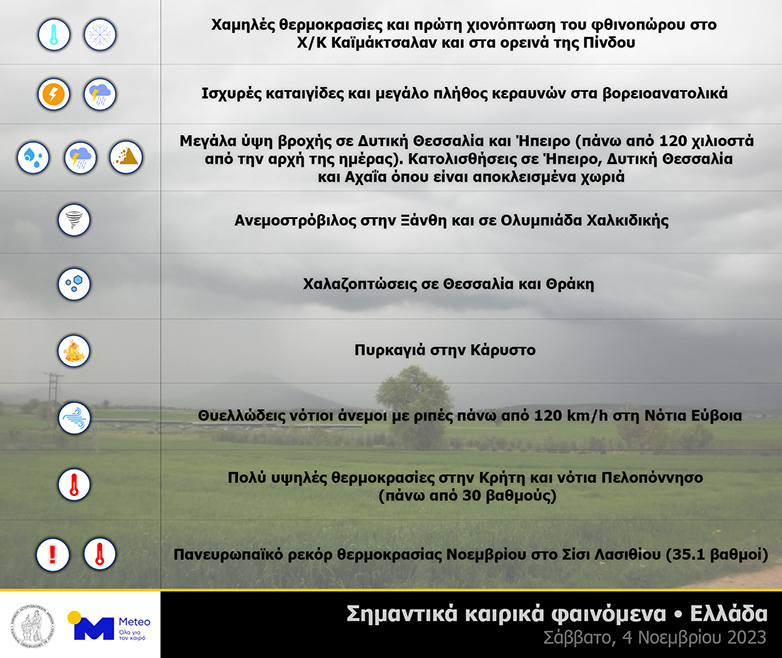 Λόγω της διέλευσης του ψυχρού μετώπου από τη χώρα μας, μέχρι και τις μεσημεριανές ώρες του Σαββάτου 4 Νοεμβρίου, εκδηλώθηκε μεγάλο πλήθος φαινομένων με σημαντική γεωγραφική διασπορά, σύμφωνα με το meteo.gr του Εθνικού Αστεροσκοπείου Αθηνών για την κακοκαιρία.