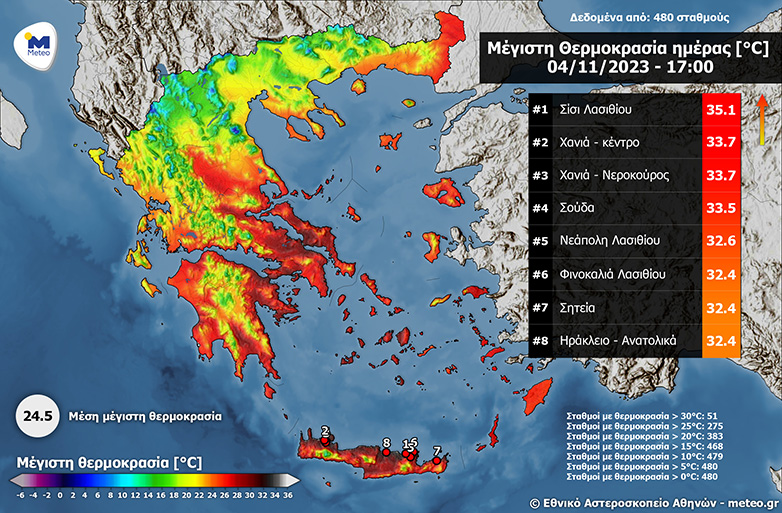 Όσον αφορά στις μέγιστες θερμοκρασίες, η γεωγραφική κατανομή των οποίων αποτυπώνεται στον χάρτη που ακολουθεί, 51 μετεωρολογικοί σταθμοί κατέγραψαν μέγιστες μετρήσεις άνω των 30 βαθμών. Η μεγαλύτερη εξ αυτών σημειώθηκε στο Σίσι Λασιθίου, όπου οι 35,1 βαθμοί που καταγράφηκαν αποτελούν Πανευρωπαϊκό Ρεκόρ Νοεμβρίου.