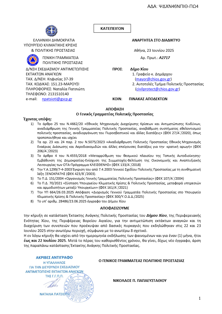 Εν τω μεταξύ σε κατάσταση έκτακτης ανάγκης πολιτικής προστασίας κηρύχθηκε λόγω των πυρκαγιών ο δήμος Χίου από χθες Κυριακή 22 Ιουνίου έως τις 22 Ιουλίου 2025, με απόφαση του γενικού γραμματέα Πολιτικής Προστασίας κ. Νικολάου Παπαευσταθίου.
