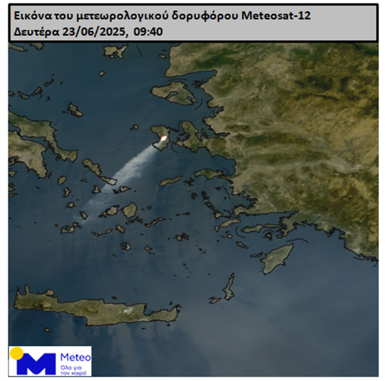 Στο μεταξύ ενισχυμένοι άνεμοι πνέουν στην μέση και κατώτερη τροπόσφαιρα στην περιοχή της Χίου, με αποτέλεσμα τη μεταφορά του καπνού από την πυρκαγιά προς τις Κυκλάδες. Η πυρκαγιά και ο καπνός της είναι ακόμη ορατός από τον δορυφόρο Meteosat-12. Στην ψευδοχρωματισμένη εικόνα του δορυφόρου από τις 09:40 της Δευτέρας 23/06 φαίνεται ο ότι καπνός από την φωτιά της Χίου εκτείνεται από της καιγόμενες περιοχές έως την Κίμωλο (~ 215 χιλιόμετρα).