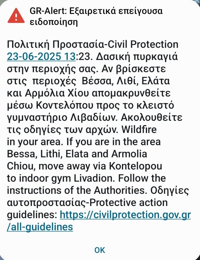 Ειδικότερα, το μήνυμα αναφέρει: «Δασική πυρκαγιά στην περιοχή σας. Αν βρίσκεστε στις περιοχές Βέσσα, Λιθί, Ελάτα και Αρμόλια Χίου απομακρυνθείτε μέσω Κοντελόπου προς το κλειστό γυμναστήριο Λιβαδίων. Ακολουθείτε τις οδηγίες των Αρχών».