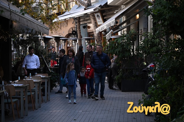 Με λιακάδα και θερμοκρασίες που αγγίζουν τους 19 βαθμούς Κελσίου, ανήμερα των Χριστουγέννων, όσοι δεν έφυγαν για τριήμερο «κατέβηκαν» βόλτα στο στολισμένο κέντρο της Αθήνας.