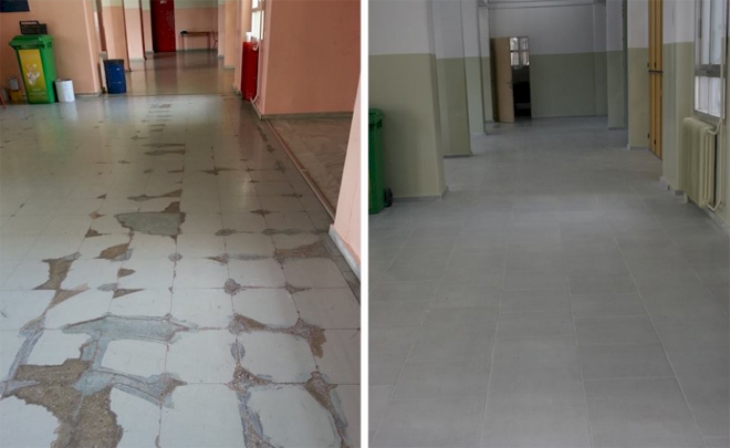 – αλλαγή δαπέδων, επισκευή στέγης, τοποθέτηση αντιολισθητικής μεμβράνης σε σκαλοπάτια